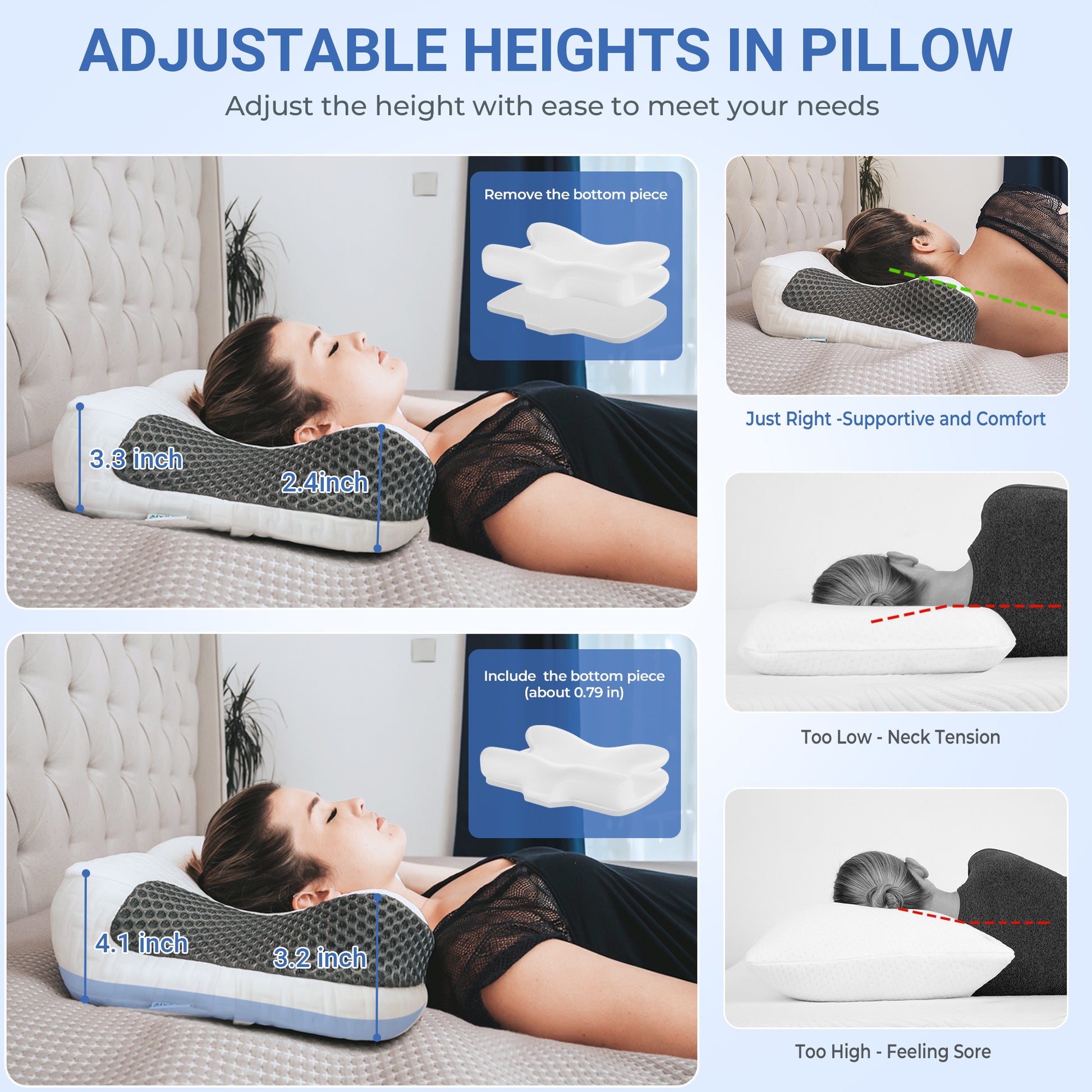 Just simply rotate your pillow 180° to enjoy two height options. What's more, there is a removable piece (0.79" thick) at the bottom to allow you to customize more heights.