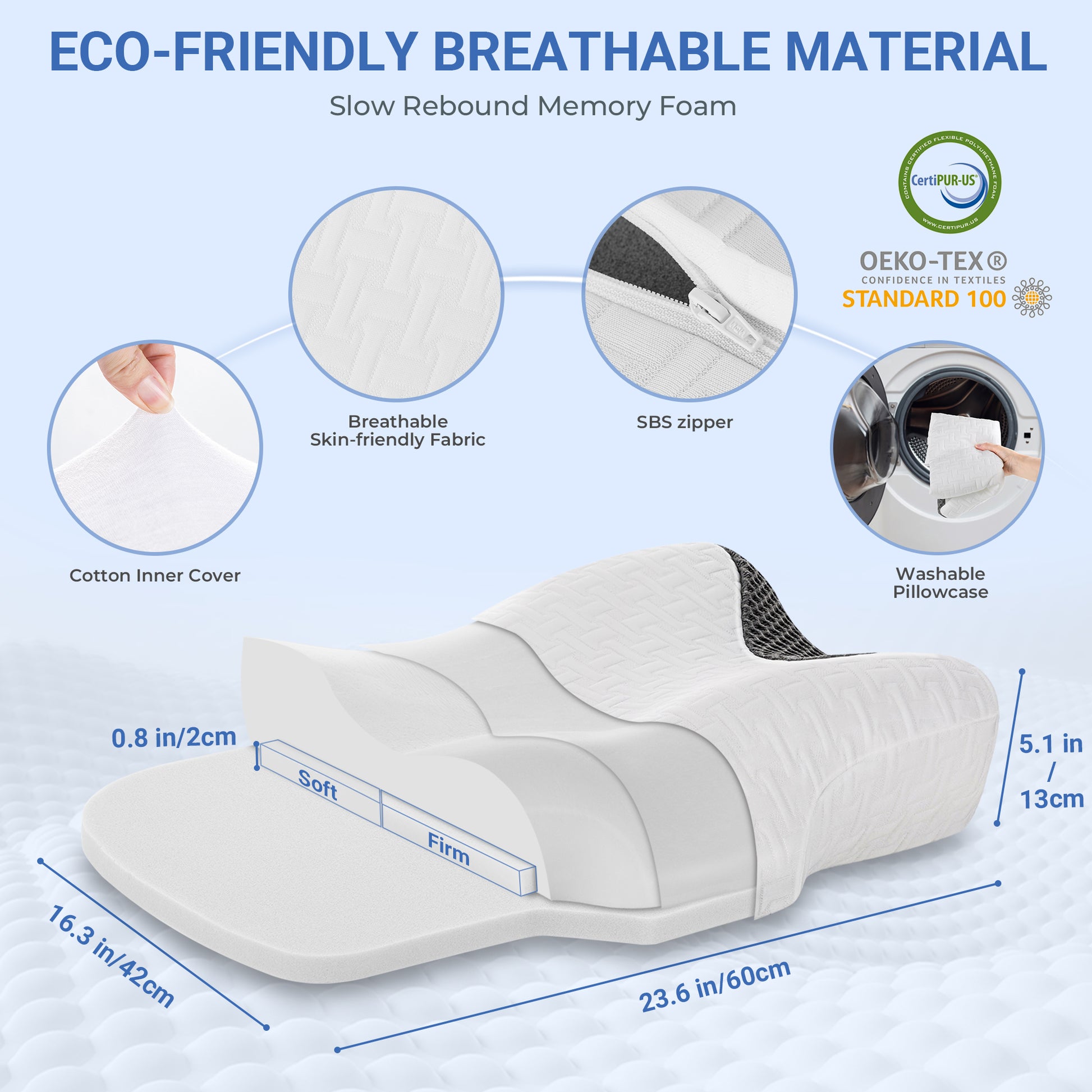 Elviros orthopedic pillow measures 23.6"(H) X 16.3"(W) X 3.3/2.4"(H) (without base piece). Simply rotate the pillow to get 2 different heights. Sleepers with cervical issues can sleep on the higher side of the pillow, which provides better support for the head and cervical. In addition, the removable 0.79" base piece offers more height options. Add the insert at the bottom, the heights of pillow become 4.1/3.2 inch.