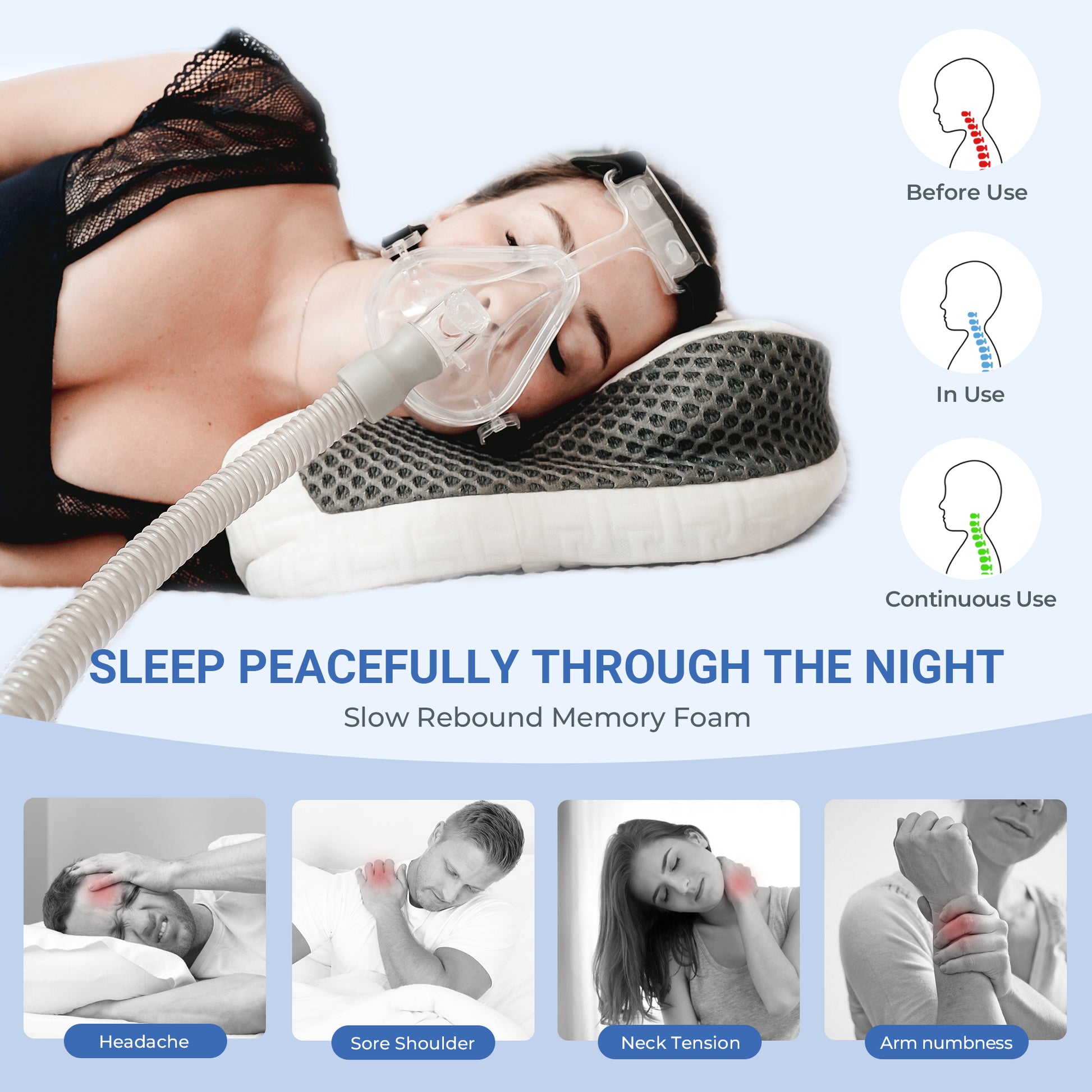 Unique cutout reduce air leaks and alleviate mask pressure on the face while providing natural spine support. No more struggling with red facial lines, tangled tubing and night-time disturbances.
