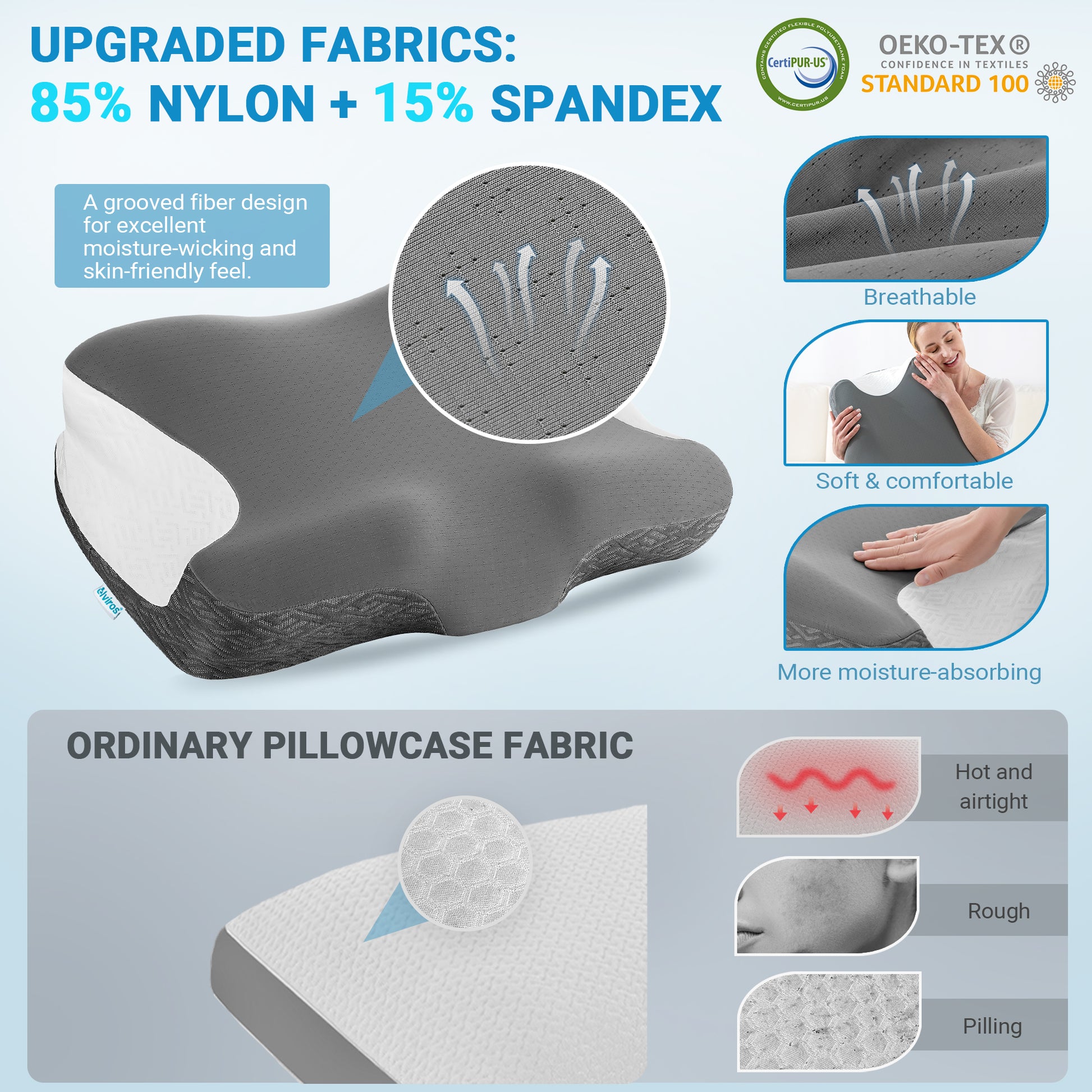 This CertiPUR-US certified and Oeko-Tex approved pillows is non-toxic and hypoallergenic. Elviros ergonomic sleeping pillow core is made of high- density slow rebound memory foam. That will provide sleeping firm support with amazing comfort and softness. Keeps its shape and firmness for long term use.